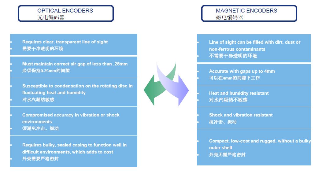 可靠的編碼器,必須保證每次轉(zhuǎn)過相同的角度發(fā)出同樣數(shù)量的脈沖。光編碼器光收發(fā)器和旋轉(zhuǎn)碼盤比磁編碼器的芯片更容易損壞。磁編碼器幾乎沒有運動部件。而光編碼器靠著脆弱的機構(gòu)來獲取信號。