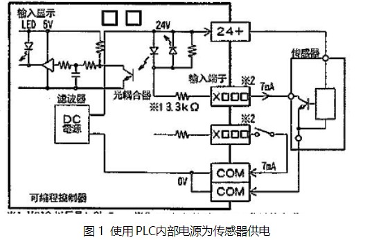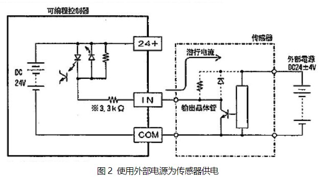 NPN集電極開路輸出的傳感器與三菱FX2N?PLC的連接示意