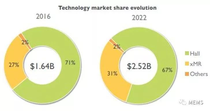 根據(jù)Yole發(fā)布的《磁傳感器市場與技術(shù)-2017版》報(bào)告,2016年,全球磁傳感器市場規(guī)模為16.4億美元,汽車是其中最大的磁傳感器業(yè)務(wù)板塊,占據(jù)2016年整體市場50%以上的份額。目前,傳統(tǒng)的內(nèi)燃機(jī)(ICE)車輛中使用了20~30個(gè)磁傳感器。在混合動(dòng)力汽車中,由于需要更多的電流傳感器,因此磁傳感器的使用數(shù)量可能上升至35個(gè)。