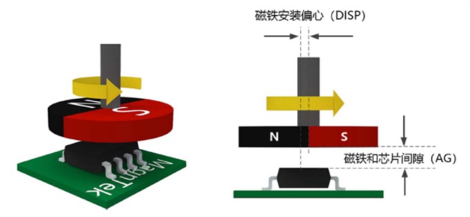 如果需要測量旋轉(zhuǎn)運動,可以同軸或離軸形式將旋轉(zhuǎn)編碼器芯片安裝在旋轉(zhuǎn)軸的末端。兩種形式通常均可用在電機中,它們可跟蹤旋轉(zhuǎn)軸的位置并測量已旋轉(zhuǎn)的角度。同軸形式的編碼器位于旋轉(zhuǎn)軸的頂端,磁體則安裝在旋轉(zhuǎn)軸上。離軸形式的編碼器是通孔型編碼器,它尤其適合磁環(huán)圍繞旋轉(zhuǎn)軸且線纜必須穿過磁環(huán)的應(yīng)用,而編碼器的位置遠離軸線(離軸 = 通孔)。磁環(huán)可以軸向或徑向磁化。