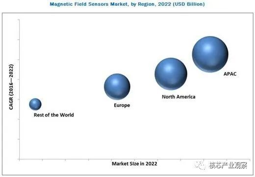目前主要的磁傳感技術(shù)根據(jù)工作原理的不同,包括霍爾、AMR(各向異性磁阻傳感器)、GMR(巨磁阻)、TMR(隧道磁電阻)、磁通門(mén)、磁感應(yīng)(Magneto Inductive)、超導(dǎo)量子干涉儀(SQUID)等。據(jù)市場(chǎng)調(diào)研公司MarketsandMarkets預(yù)測(cè),全球磁傳感器市場(chǎng)規(guī)模預(yù)計(jì)將從2015年的22.5億美元增長(zhǎng)至2022年的41.6億美元,2016~2022年間的年復(fù)合增長(zhǎng)率為8.87%,增長(zhǎng)勢(shì)頭強(qiáng)勁。