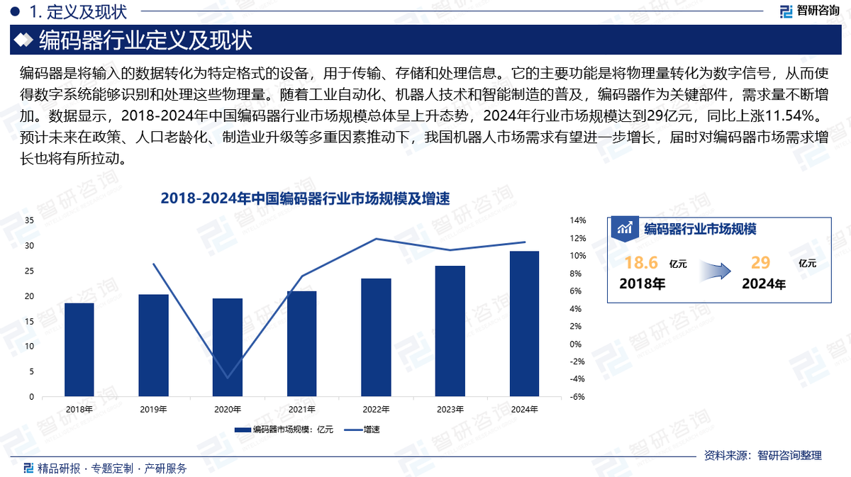 隨著工業(yè)自動(dòng)化、機(jī)器人技術(shù)和智能制造的普及,編碼器作為關(guān)鍵部件,需求量不斷增加?。數(shù)據(jù)顯示,2018-2024年中國編碼器行業(yè)市場規(guī)模總體呈上升態(tài)勢,2024年行業(yè)市場規(guī)模達(dá)到29億元,同比上漲11.54%。預(yù)計(jì)未來在政策、人口老齡化、制造業(yè)升級(jí)等多重因素推動(dòng)下,我國機(jī)器人市場需求有望進(jìn)一步增長,屆時(shí)對(duì)編碼器市場需求增長也將有所拉動(dòng)。